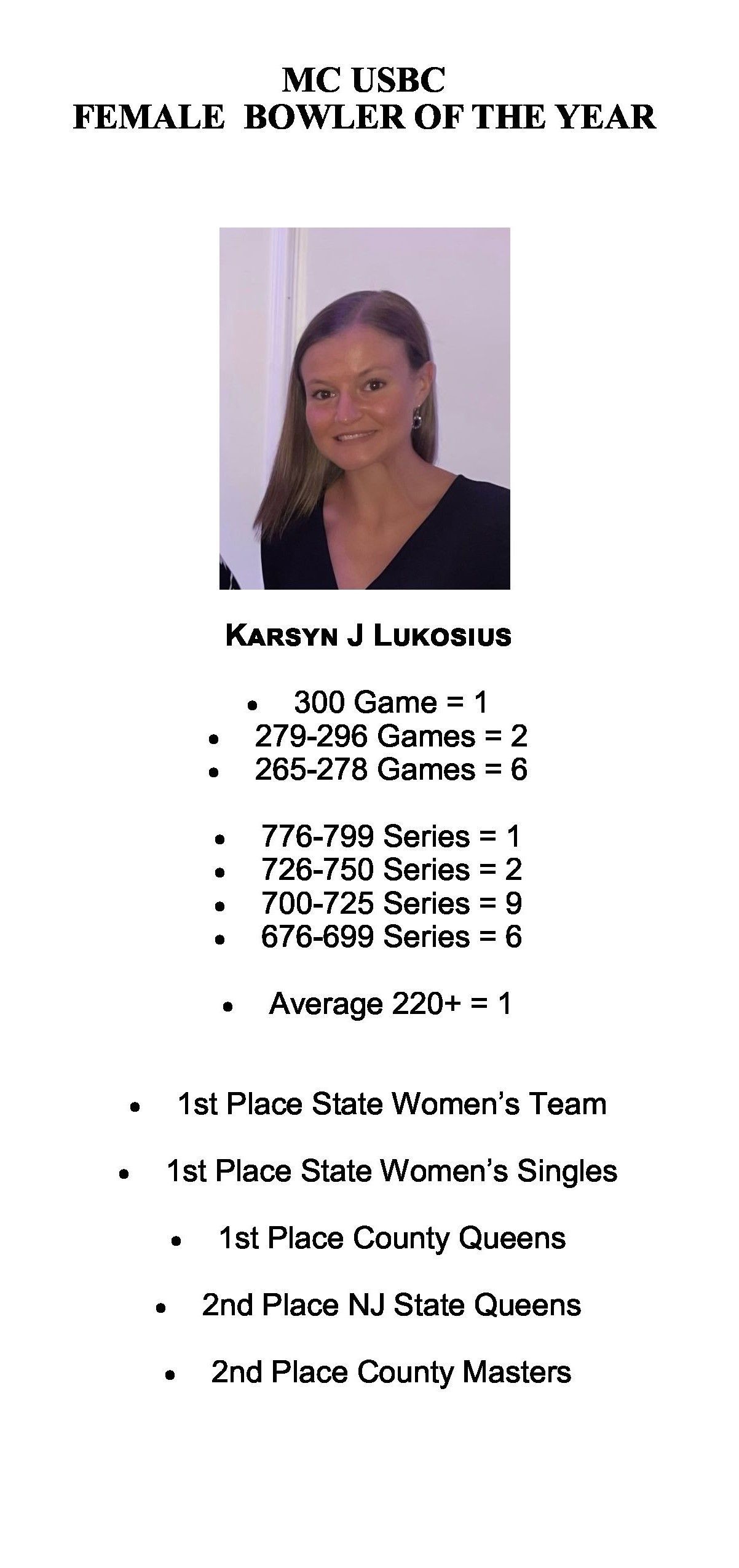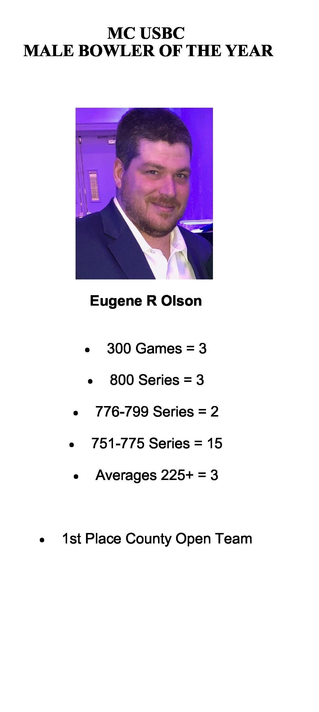 On                                              September 14, 2025                                               , the Monmouth County USBC proudly hosted its                                              Annual Hall of Fame and Officers Installation Dinner                                               at the beautiful                                              Jumping Brook Country Club in Neptune, NJ                                  . This prestigious evening brought together bowlers, family, and friends to celebrate the accomplishments of our outstanding members and recognize their contributions to the sport we all love.                                                                                                  The highlight of the night was the induction of                                              Eugene R. Olson                                               into the                                              Monmouth County USBC Hall of Fame                                  , honoring his dedication and achievements on the lanes.                                                                                                  The celebration continued with the presentation of our                                              2025 Bowler of the Year awards                                               , recognizing                                              Chris Germain                                               and                                              Karsyn J. Lukosius                                               for their remarkable seasons. Both Olson and Lukosius also claimed the                                              High Average Awards                                               , while                                              Robert Geyer                                               and                                              Emerald G. Platzer                                               earned top honors as our                                              High Series Winners                                  .                                                                                                  This year’s                                              Female 300 Award Winners                                               showcased incredible talent and determination on the lanes:                                              Dorothy M. Salinas, Alexa Asta, Theresa Hubert, and Madison Mosley                                  .                                                                                                  In addition,                                              Nancy Dango                                               and                                              Michelle Marrocco                                               were recognized with a                                              Special Achievement Award                                               for their extraordinary efforts in helping raise                                              $37,000 for BVL                                  —a record-breaking accomplishment that reflects the generosity and spirit of our bowling community.                                                                                                  We extend our heartfelt thanks to everyone who attended and supported this memorable event. Congratulations once again to all of our honorees, and a warm welcome to our newest Hall of Fame Inductee,                                              Eugene R. Olson                                  .